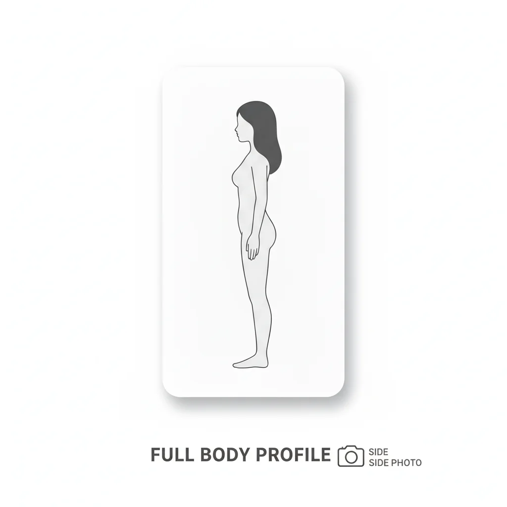 - Three full-body photos: front, side and back, standing straight, neutral light